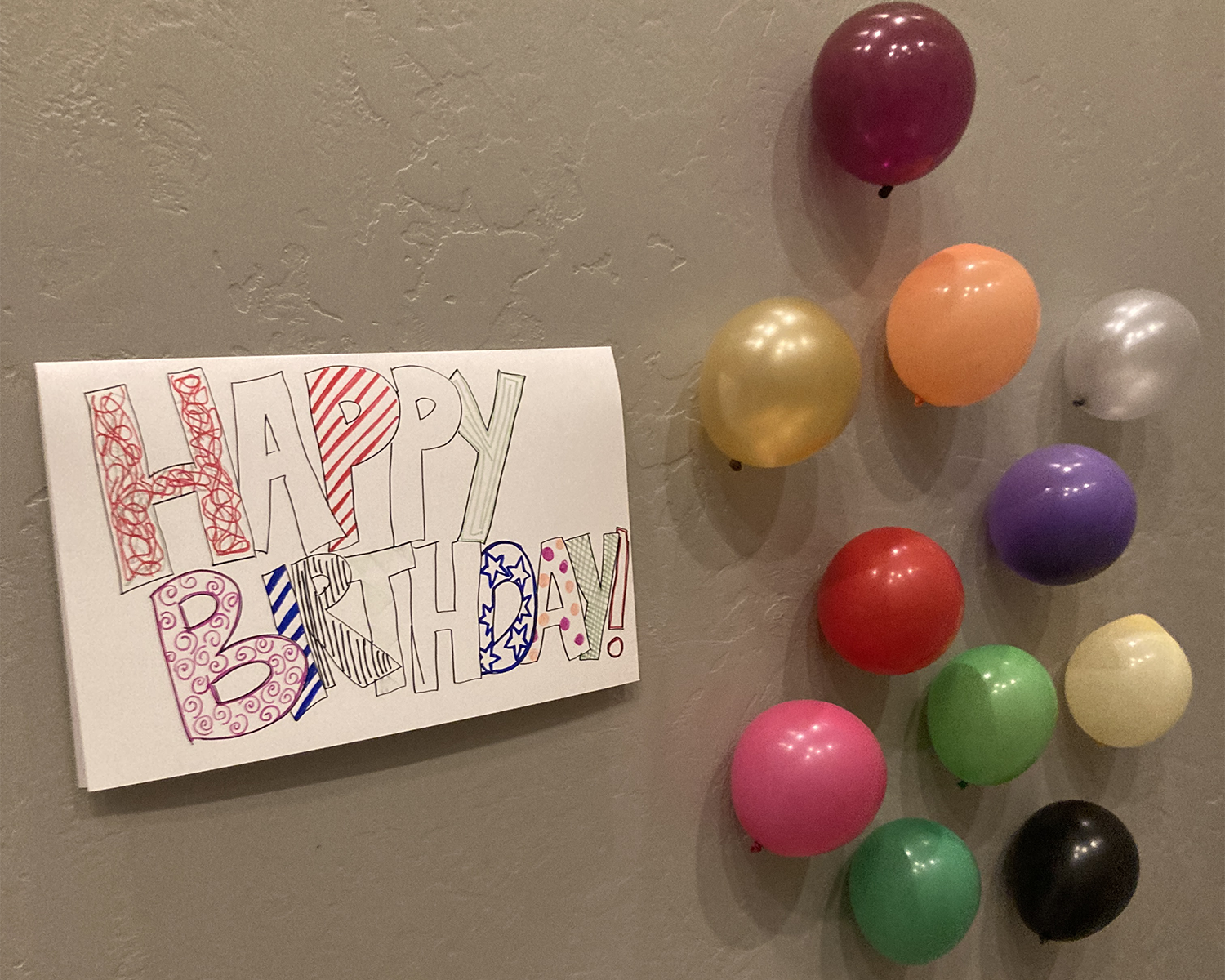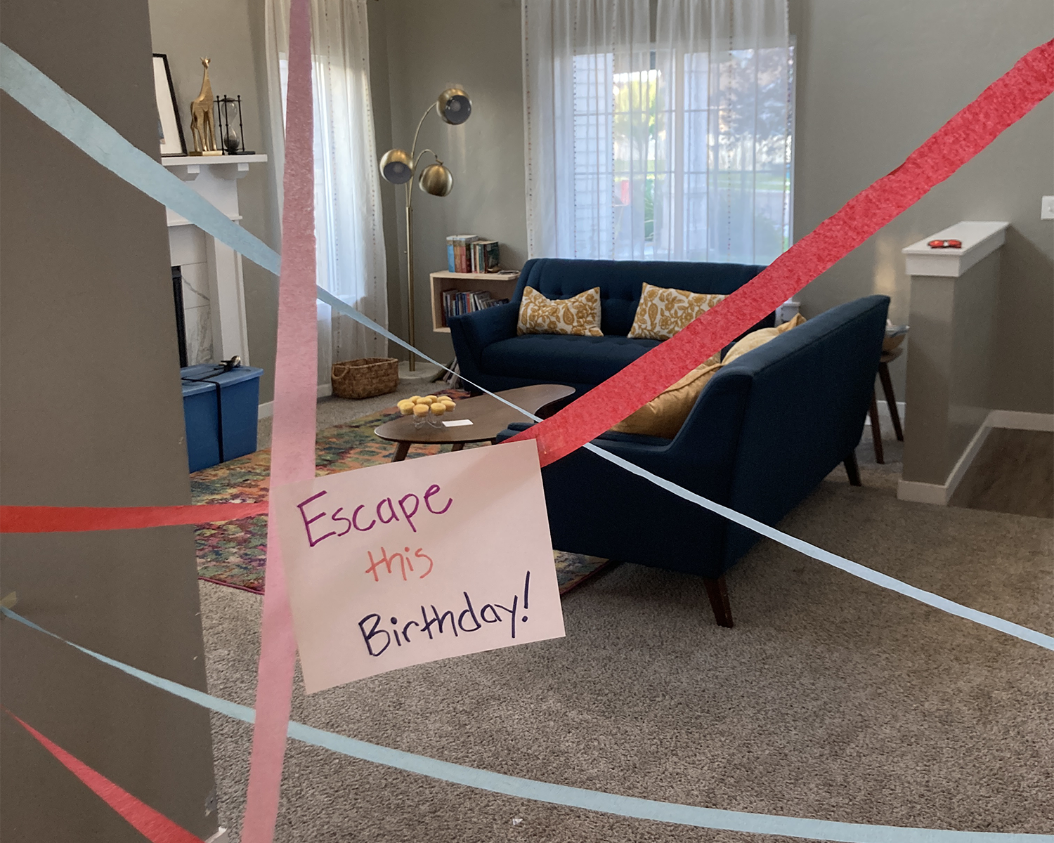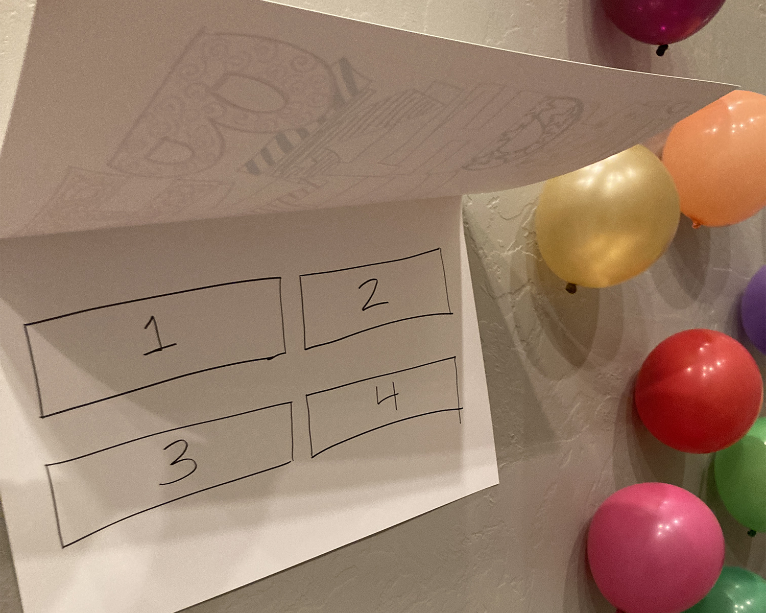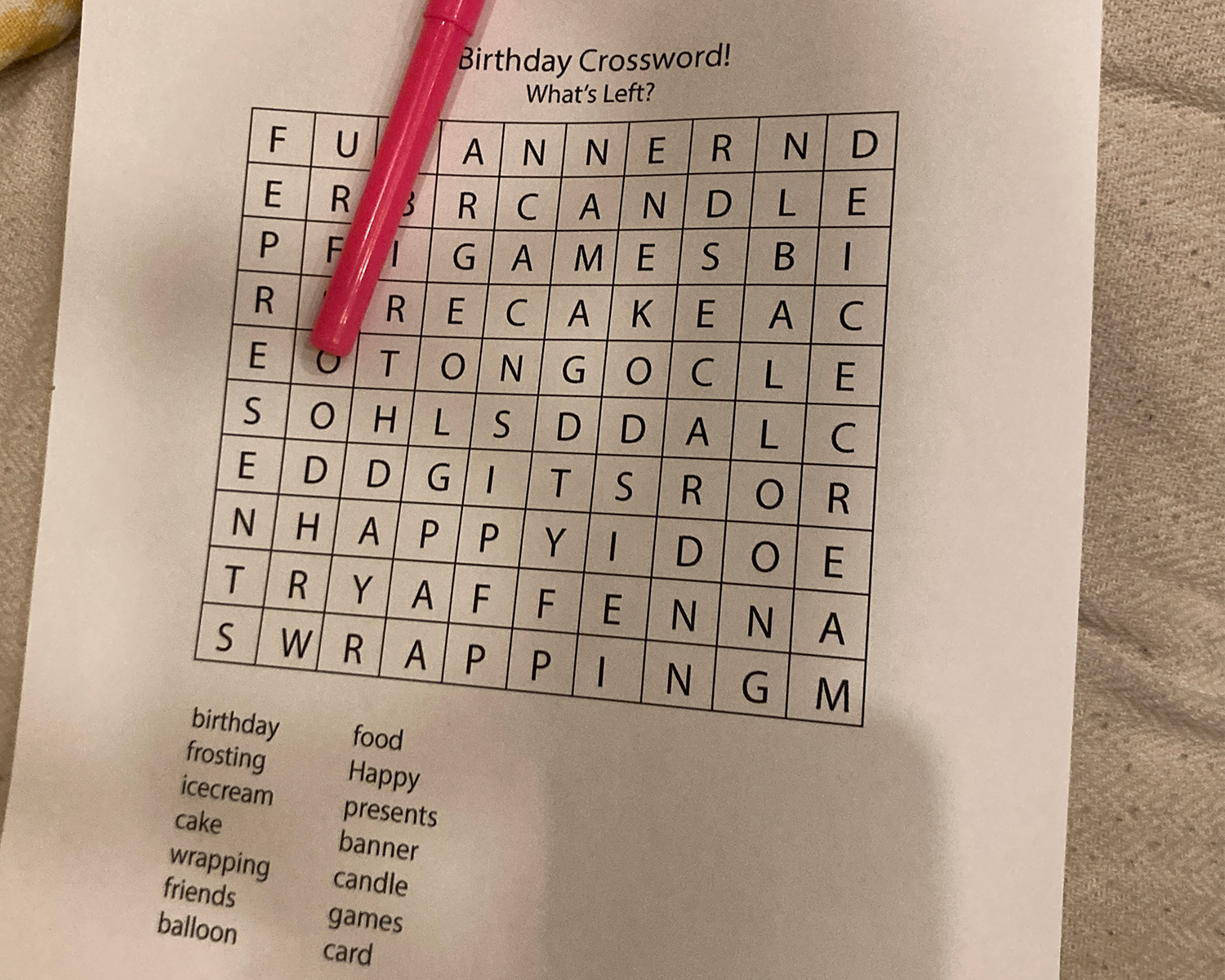 The first trail they tackled started with the 11 balloons on the wall. After trying to figure out if there was some kind of pattern or color message, they eventually realized there were papers inside and they popped them (that was fun). I had written the letters P O C K E T and the number 4 ( Pocket was word #4) on little pieces of paper in descending size to help figure out the order. I guessed right that this might need an extra clue, so I also had a crossword on the table that I made with a free online crossword generator. Across the top was the question, “what’s left?” The leftover letters were directions to a hint, “Under giraffe statue”. Under which had a graphic with a number 4 and letters lined up in ascending size. I thought they would 100% have it figured out at that point, but it took them solving a few other clues to realize that the number 4 on both clues meant that these two clues went together. They did however realize that it went to the 4 on the giant card and taped the card up there.