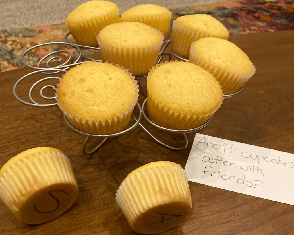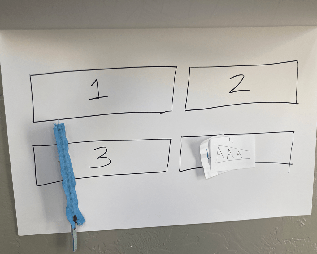 Next, there were cupcakes on the table (this picture the is of them pre-frosted the night before). A sign next to them said, “Aren’t cupcakes better with friends?” On the bottom of the wrappers I wrote the letters of the name of his friend who lives next door. The kids all ran next door, and I had already talked to this friend and his parents and gave him a clue to bring when they came. His clue was a zipper with the number 3 written on it (that was word #3–zipper).