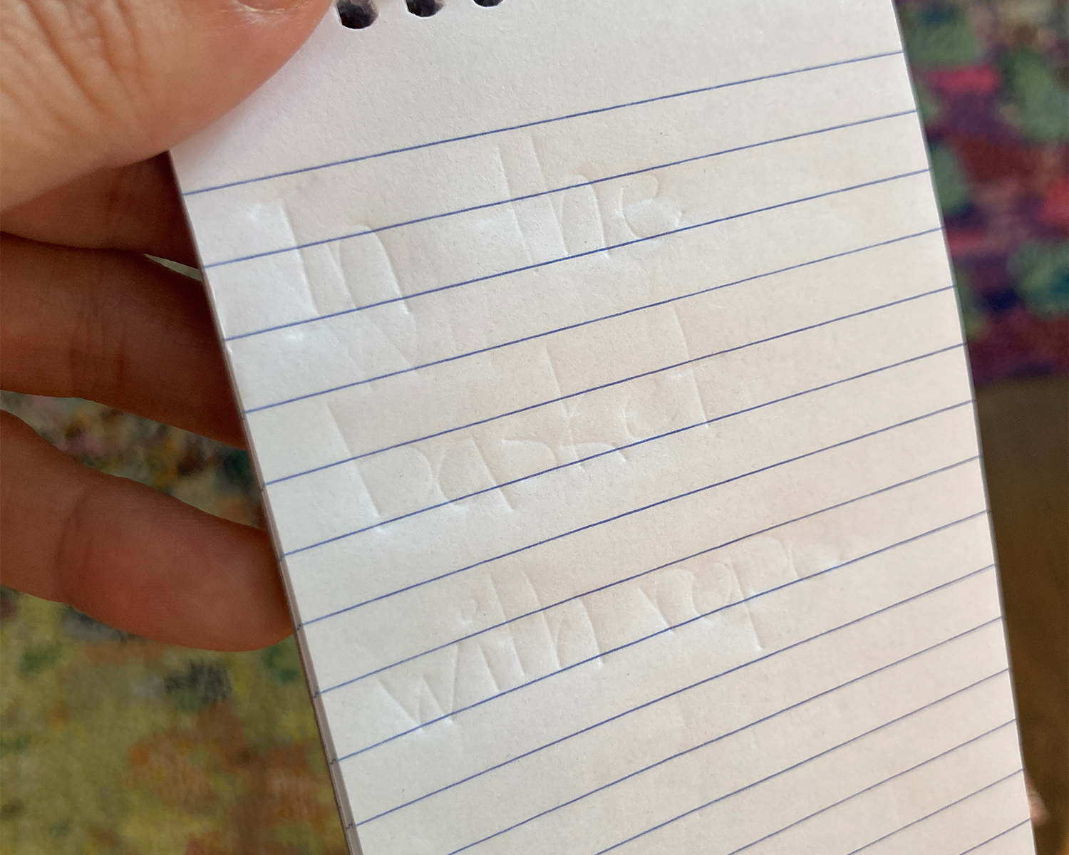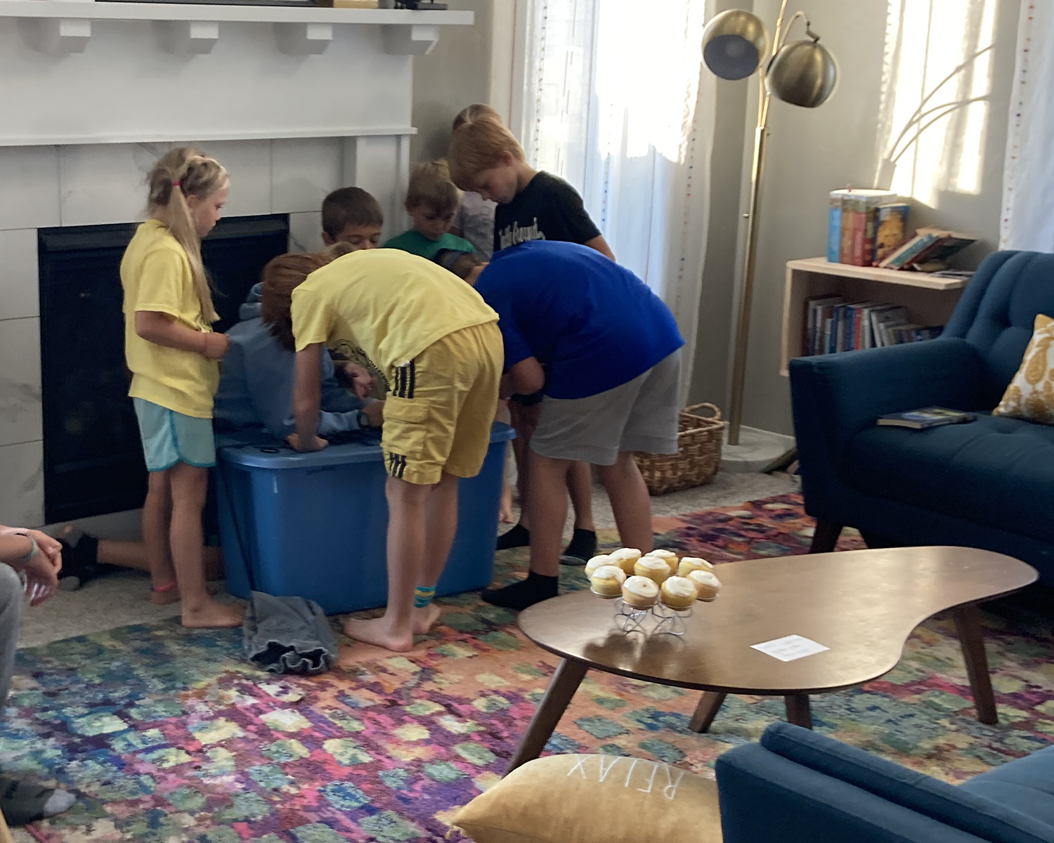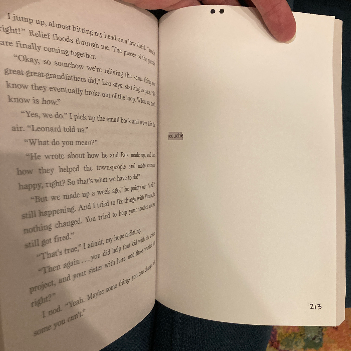 This sent them to a small bookshelf I have in the room, that only holds some of our favorite series. Hidden among the Chronicles of Narnia was the book 11 Birthdays (which they knew immediately was important because it was my son’s 11th birthday!) This clue met up here with another tiny trail. I had a notebook on the table, that I had written on the top page with a pen, and then tore that off so just the imprint was left– hard to see, but not too hard. That told them where to look to find a cardstock that I had cut to the size of the book page, and cut out with a xacto knife the exact spot where word #2 was on page 213. I wrote the page number the bottom corner. The word shown through the window was couch (Word #2–couch). The two dots on top were a hint that this word is clue #2.
