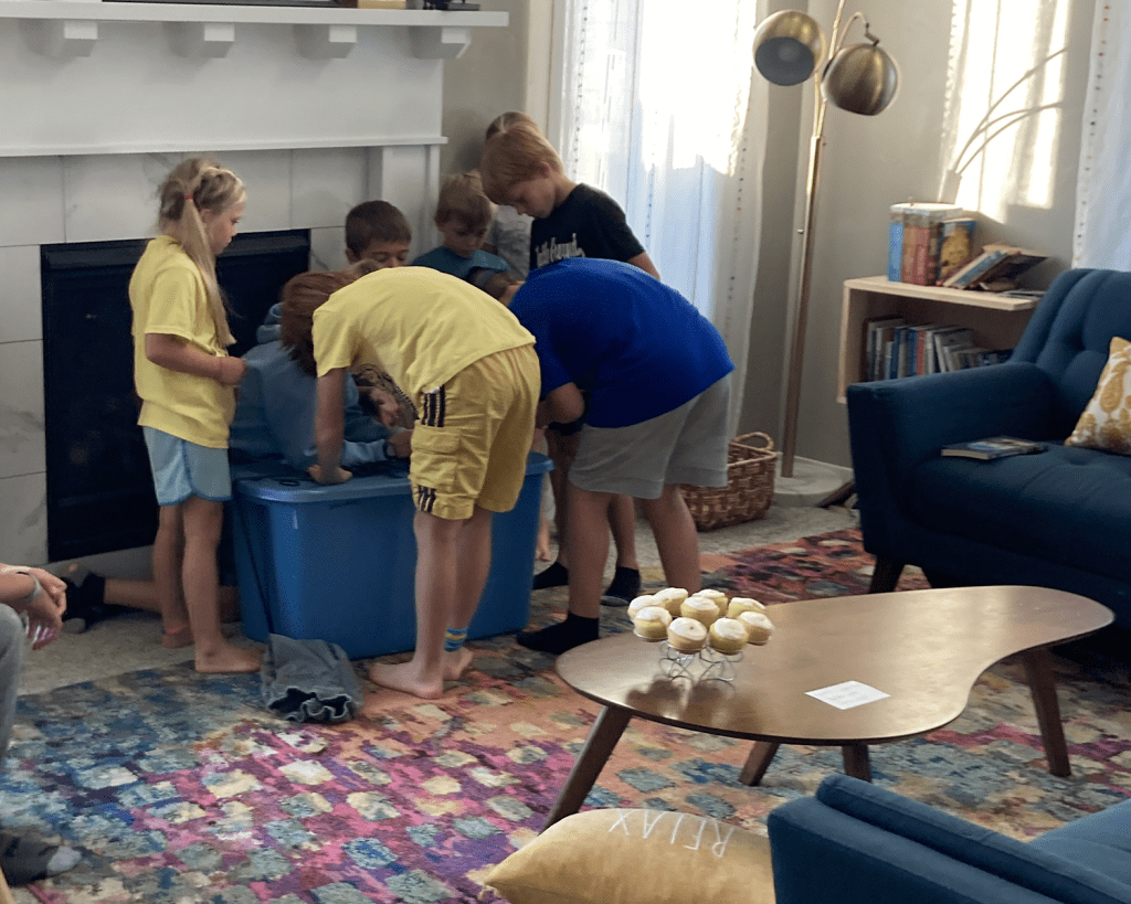 Now for the third trail! We luckily had on hand these red secret message glasses and some extra secret code paper from a spy kit. I hid both in the room (which, by the way, they took apart entirely looking for clues). The message said “Go get _____” and listed another neighbor friend. Everyone ran over to his house where he was waiting with another clue.