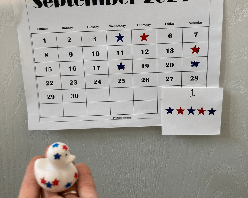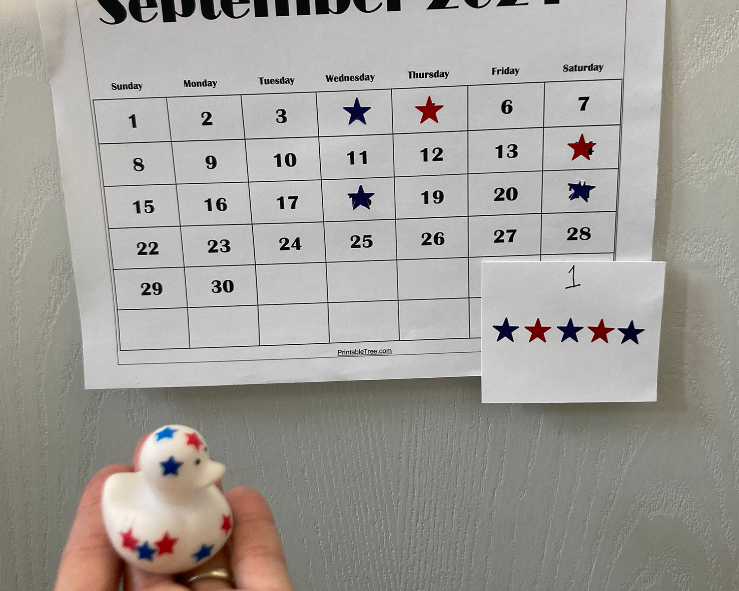 His clue was a card with a number 1, and 5 star sticker in a pattern. These stars corresponded with another clue that they had seen on the wall but didn’t know what to do with– A calendar with stars on random dates. Each of the numbers corresponded to a letter of the alphabet, and the stars on the card was a hint at what order they should go in. Now, here’s the crazy part. Unbeknownst to me, there happened to be a duck under the couch with those exact star colors (how?! I chose the sticker colors randomly!) which the kids found and were sure had to do with this clue. I eventually did have to give them a hint to get them on track that the numbers were letters and had nothing to do with a duck. The letters spelled the word U N D E R (word #1 -Under)