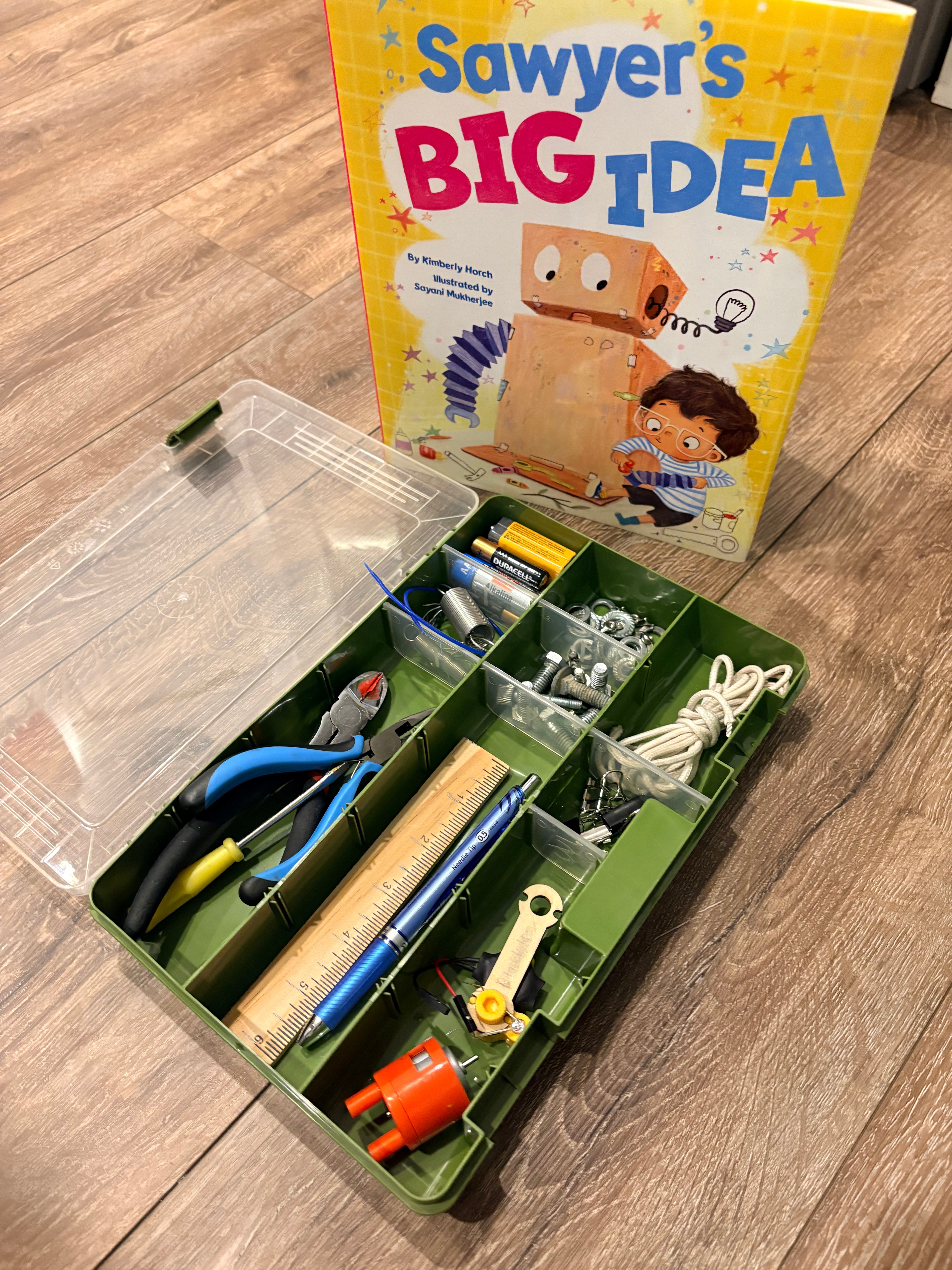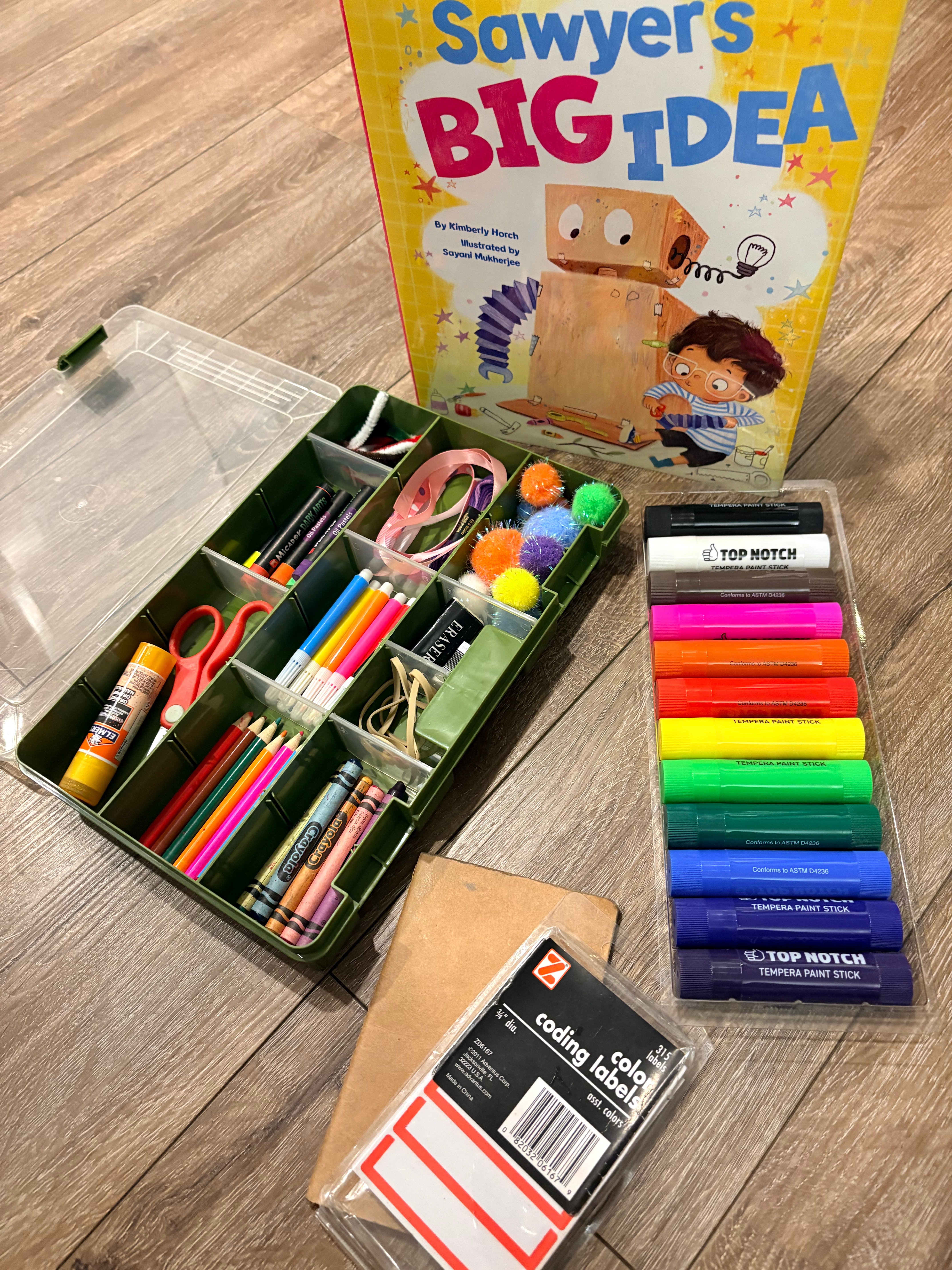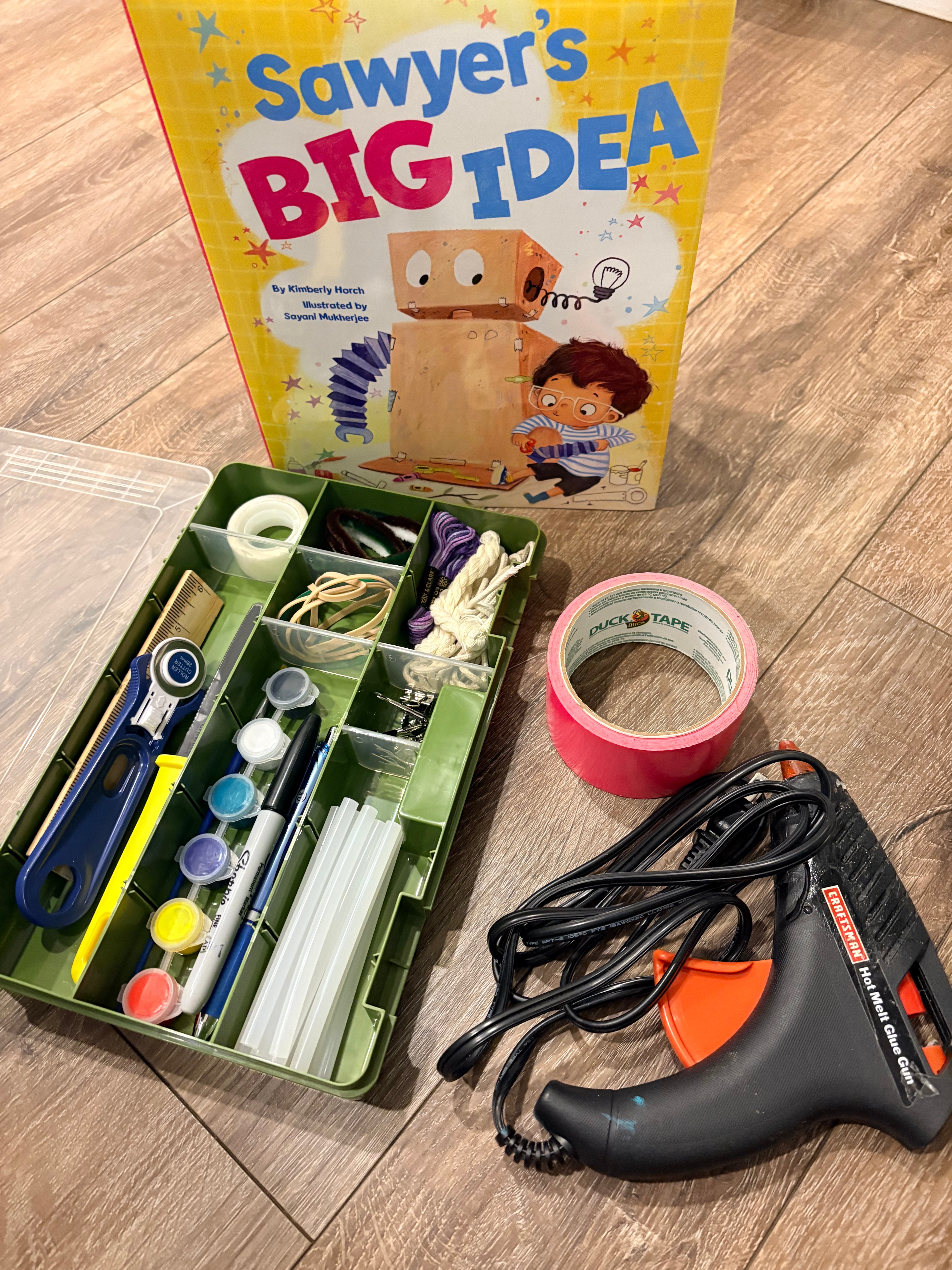 One of my kiddos is a self-proclaimed “Cardboard Smith” because he’s always cutting, duct-taping and creating cool new things, from shoes, to basketball hoops, to boxing in his bunkbed to make his own room! Last year for Christmas he asked me for duct tape and a really big box. This year, he and I worked together to design Creativity Kits for friends and cousins, to gift with copies of SAWYER’S BIG IDEA. These are a great non-toy gift to encourage creativity and STEM thinking! They are super scaleable and morph to fit different ages, interests, and budgets. I’ve done research at Walmart and Amazon to give you an idea of prices. (and FYI, I am an Amazon affiliate and may receive a small percentage when you use my links).