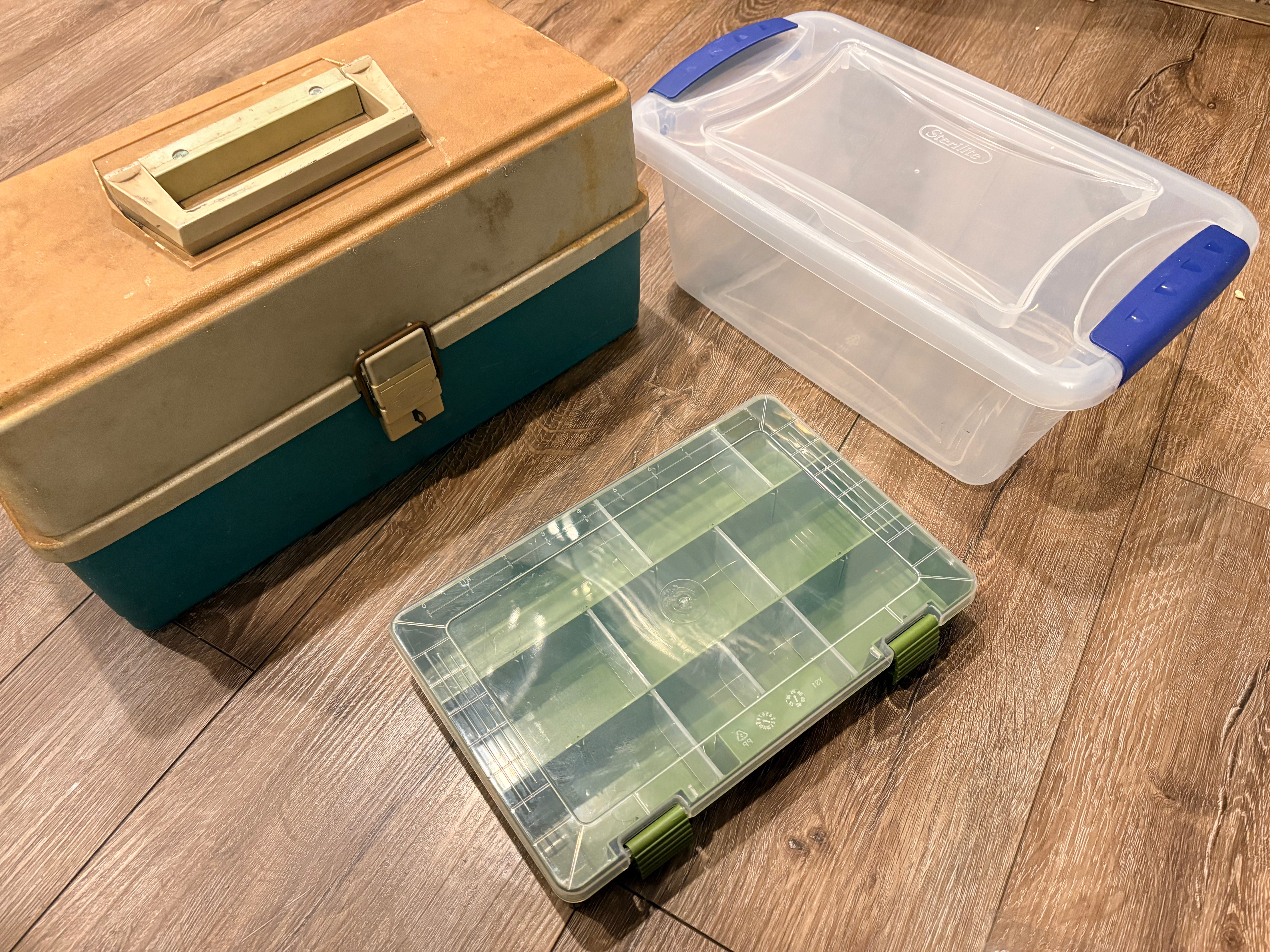 I’ve seen Caboodles under $10 at my local Ross store, and Walmart had an assortment of tackle boxes–both the traditional kind and the grid compartment kind. The green ones I’ll be using in photos below I picked up for $2.97.