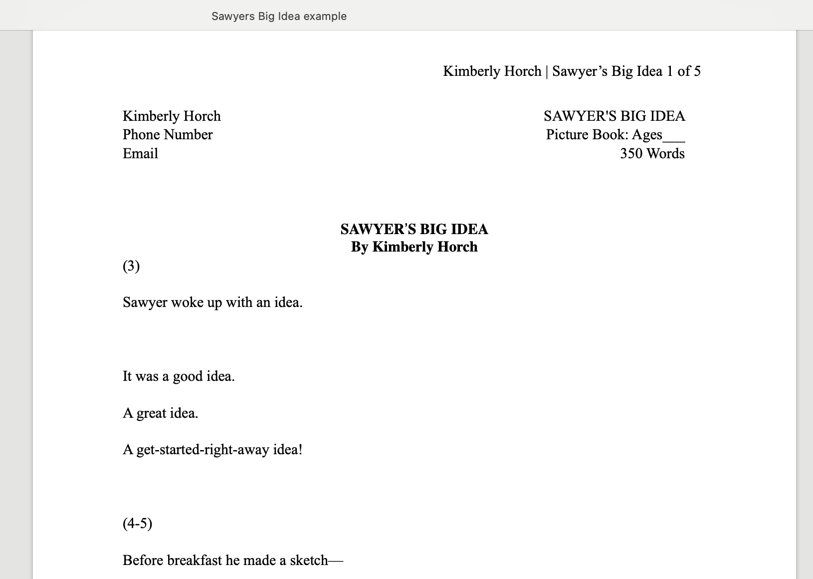 Breaking your picture book out into spreads is optional, but I find it helpful to clarify my vision, and keep editors from wondering if this is, in fact, the right length for a book. Just using parenthesis with the page number like I did above is fine. No need to get too wordy with it.